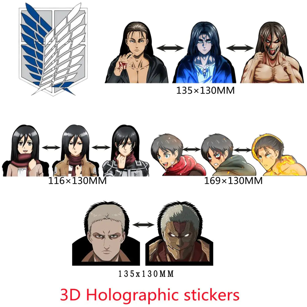 تخيل أنك تقود سيارتك على الطريق وتشاهد بدهشة إرين وميكاسا يقفزان إلى العمل أمام عينيك مباشرة! ملصقات الحركة العدسية ثلاثية الأبعاد الخاصة بنا ليست مجرد ملصقات - إنها أعمال فنية ديناميكية ساحرة تضيف بعدًا جديدًا تمامًا إلى سيارتك.