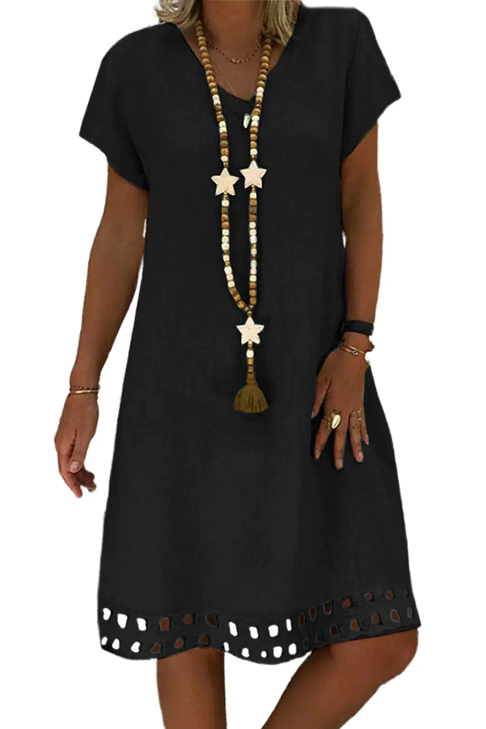 ارتقِ بأسلوبك مع فستاننا الأسود متوسط الطول بفتحة رقبة على شكل حرف V. يتميز هذا الفستان بتصميم جذاب بفتحة رقبة على شكل حرف V وحاشية مجوفة أنيقة، ويضفي لمسة من الرقي على أي مناسبة. من الخروجات غير الرسمية إلى المناسبات الخاصة، فهو خيار متعدد الاستخدامات وأنيق لخزانة ملابسك.