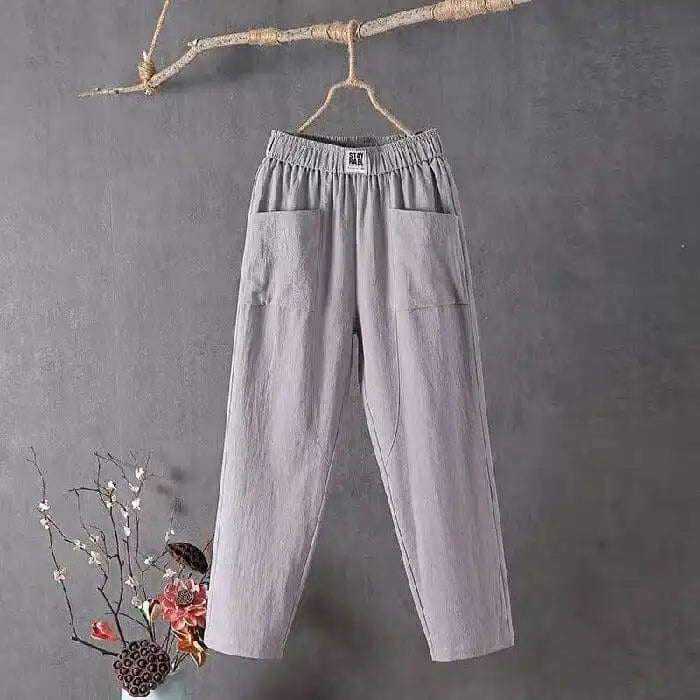 استمتع براحة لا مثيل لها مع هذه السراويل الكاجوال المصنوعة من القطن والكتان. مصممة بحزام خصر مطاطي، وتوفر ملاءمة مثالية وحرية في الحركة، مما يجعلها مثالية لأي نزهة غير رسمية.