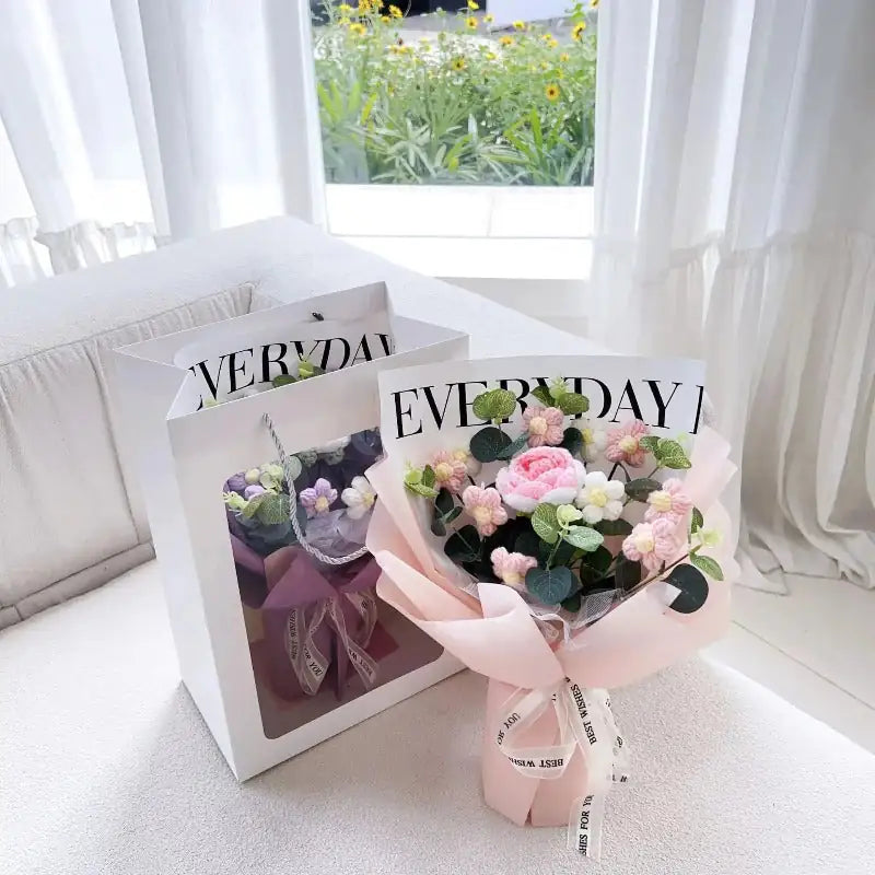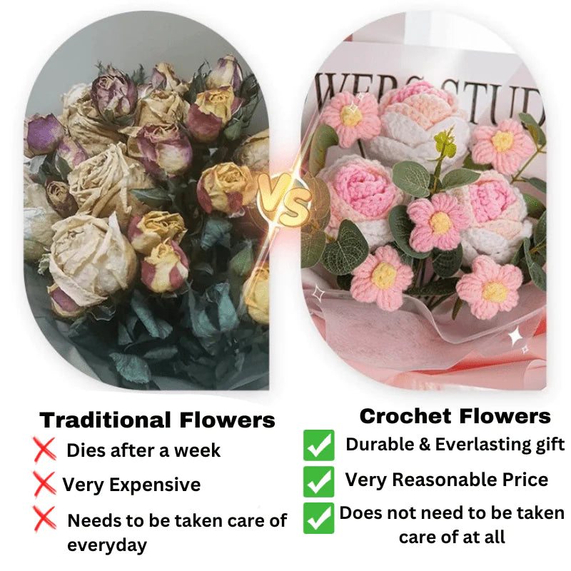على عكس الزهور الطازجة، لا تتطلب باقة الزهور الكروشيه الخاصة بنا أي صيانة ولن تذبل أو تتلاشى أبدًا، مما يسمح لك بالاستمتاع بجمالها لسنوات قادمة. بالإضافة إلى ذلك، فهي تشكل تذكارًا رائعًا يمكن تقديره وتناقله عبر الأجيال.