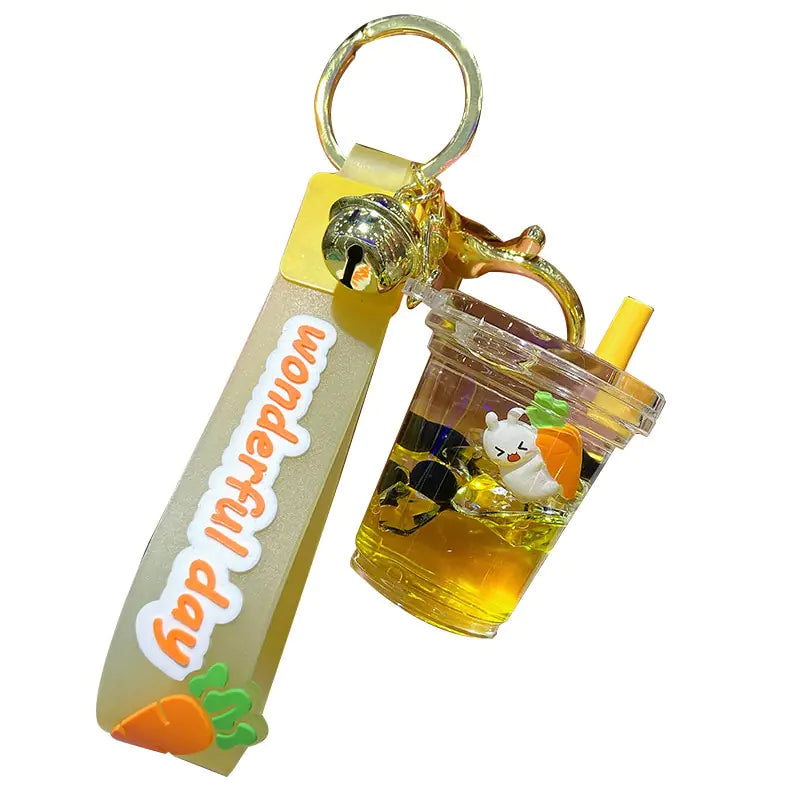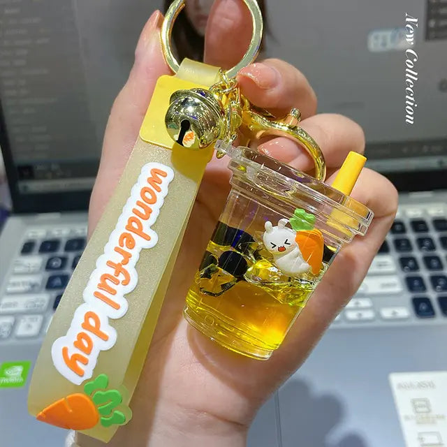 Fun and Functional: This whimsical accessory features cute cartoon rabbits and pandas enjoying a delicious cup of milk tea. The liquid inside the keychain adds a mesmerizing floating effect, making it both fun to play with and functional for keeping track of your keys.