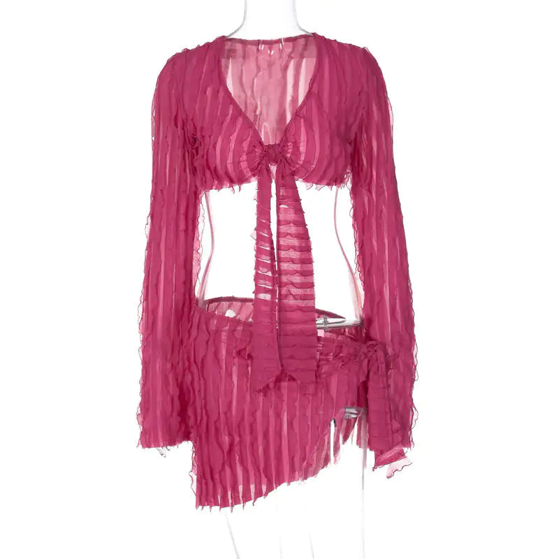 ادخلي إلى أي غرفة بثقة وأناقة. مجموعة التنورة القصيرة الأنيقة هذه، التي تتميز برباط أمامي جذاب وكشكشة مرحة، تضمن لك دخولاً لا يُنسى.