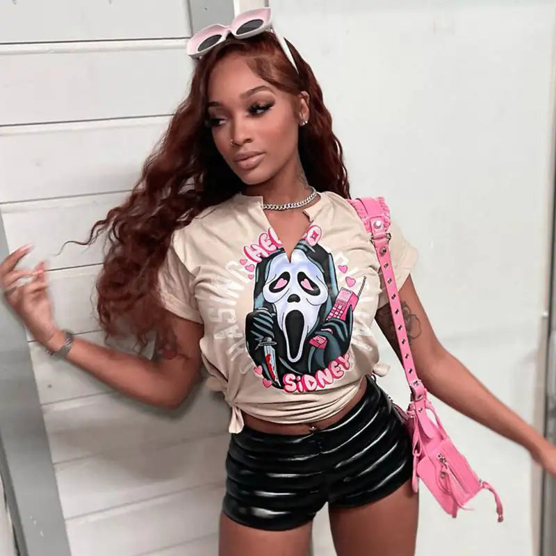استمتعي بأقصى درجات الراحة مع قميصنا القصير المطبوع برسومات جرافيكية وفتحة رقبة على شكل حرف V. مصنوع من قماش قابل للتنفس، ويحافظ على انتعاشك واسترخائك سواء كنت تستمتعين بيوم مشمس أو ترقصين في الليل.