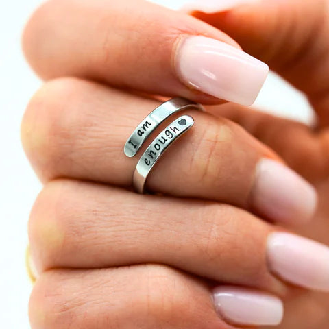 احتضن قيمتك الذاتية وأبدِ تصريحًا جريئًا بخاتم "أنا كافية". تعمل هذه القطعة المصممة بأناقة كتذكير يومي بقوتك الداخلية وقيمتك، مما يمكّنك من مواجهة العالم بثقة.