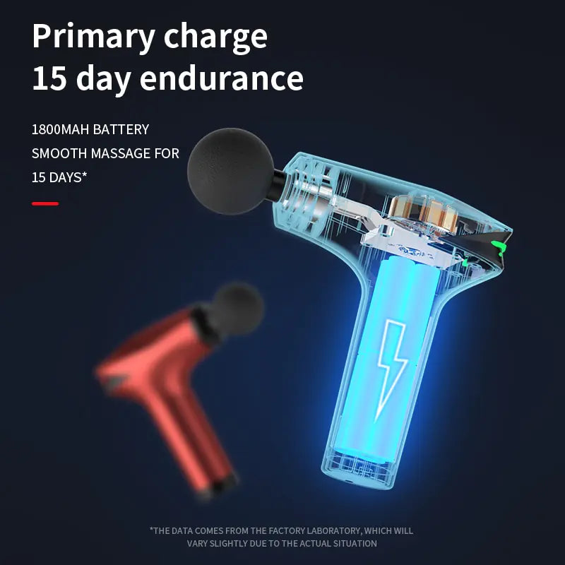 عند الحديث عن عمر البطارية، فإن مسدس التدليك الخاص بنا مزود ببطارية ليثيوم تدوم طويلاً بقوة 1800 مللي أمبير في الساعة، مما يوفر ما يصل إلى 15 يومًا من الاستخدام بشحنة واحدة. بالإضافة إلى ذلك، بفضل ميزة إيقاف التشغيل الذكية بعد 15 دقيقة، يمكنك التدليك براحة البال.