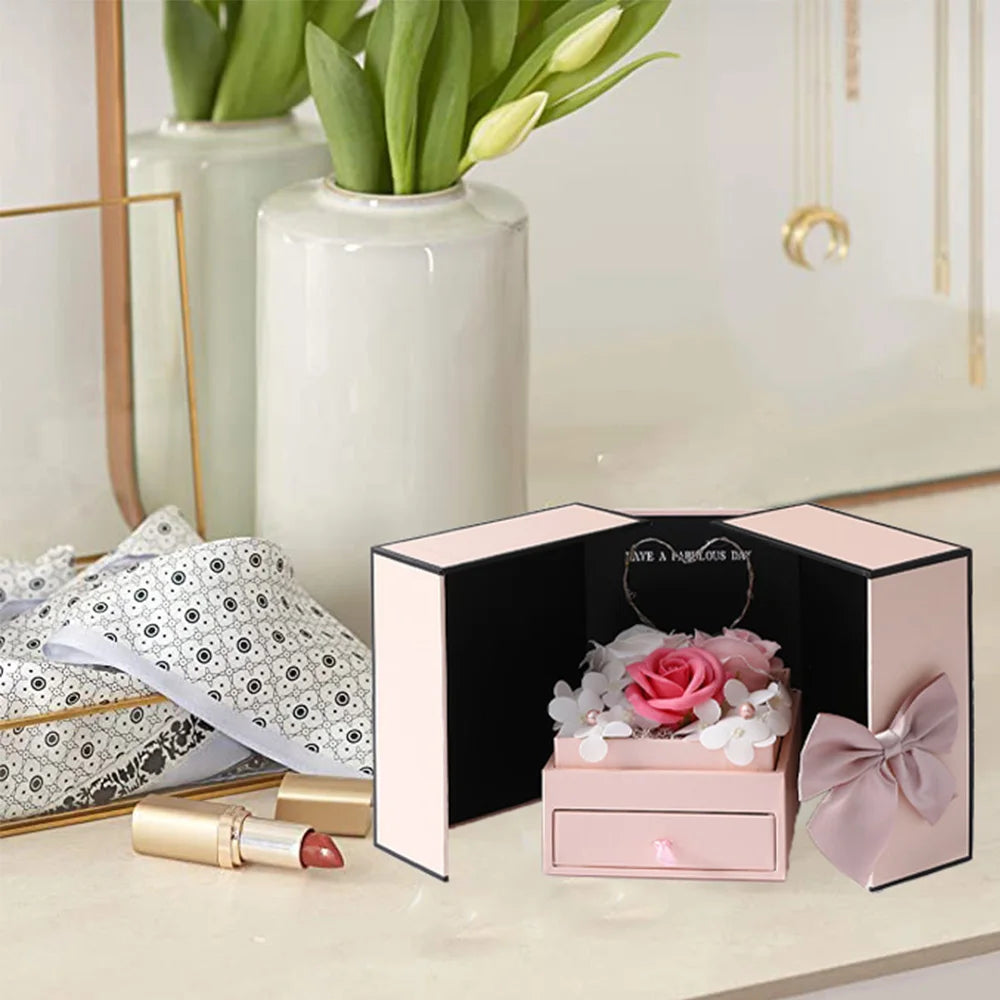 صُمم صندوق الهدايا الخاص بنا بأناقة وصمم لتوفير الراحة، ويجمع بين الجمال والوظائف لخلق عرض لا يُنسى لأحبائك. يتميز بجزء خارجي وردي مذهل مزين بمصابيح LED وزهور الصابون ومجوهرات أحمر الشفاه، ومن المؤكد أن صندوق الهدايا الخاص بنا سيترك انطباعًا دائمًا.