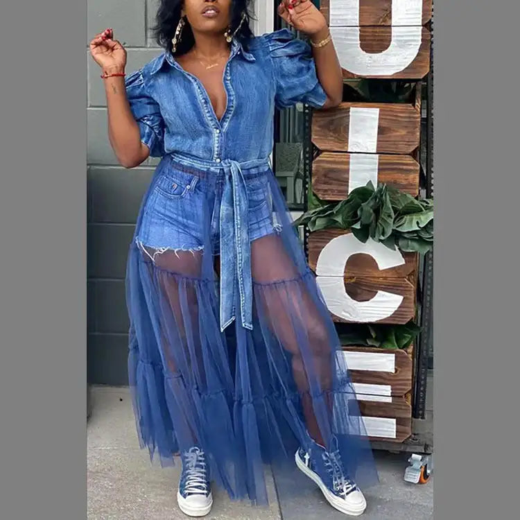 فستان جينز طويل من قماش شبكي مرقع أنيق وفريد من نوعه