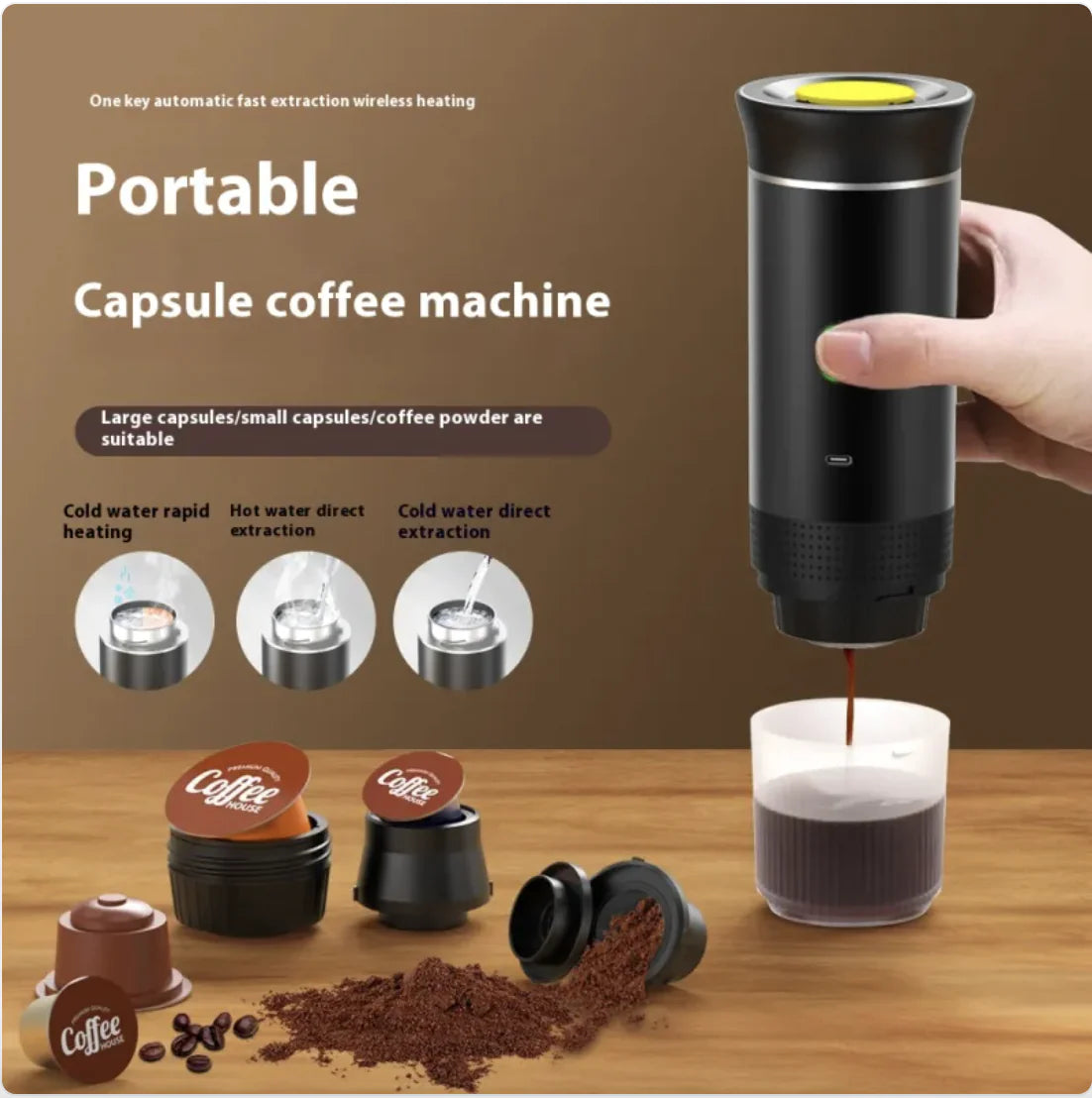 This portable Italian-style coffee machine offers the convenience of freshly brewed coffee anywhere, anytime, combining style, functionality, and portability.