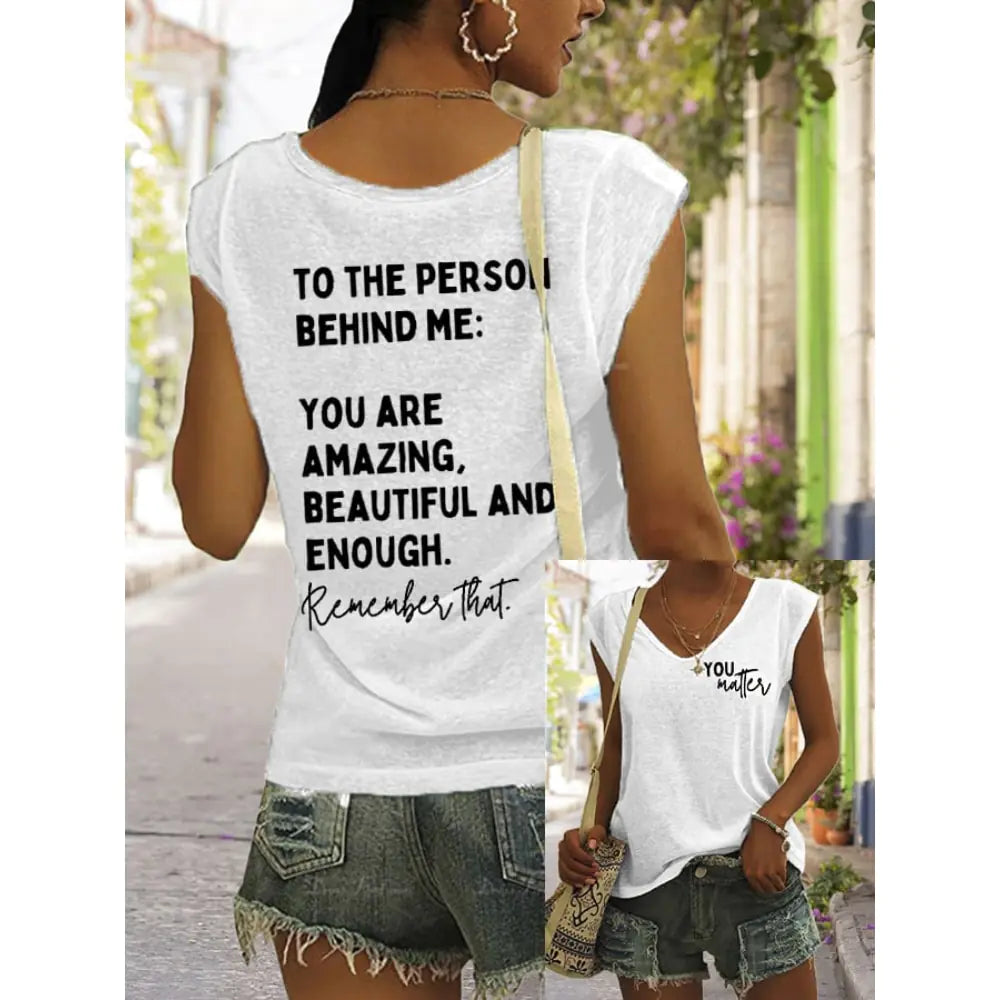 انشر الإيجابية وأبدِ رأيًا إيجابيًا بارتداء قميص Rheaclots النسائي الكاجوال بفتحة رقبة على شكل حرف V مطبوع عليه عبارة "To The Person Behind Me You Matter". ارتديه بفخر واترك مظهرك يعكس قيمك ومعتقداتك.