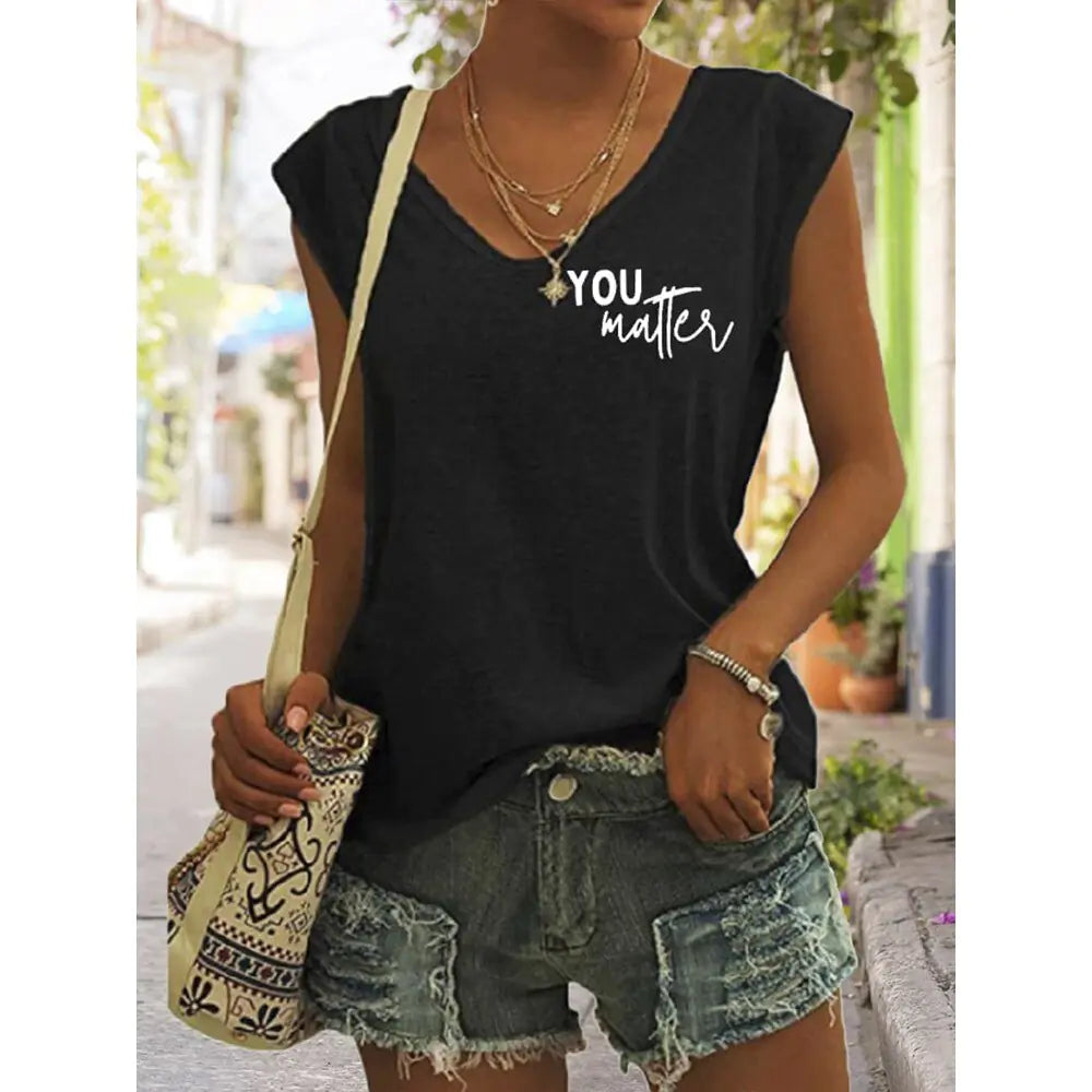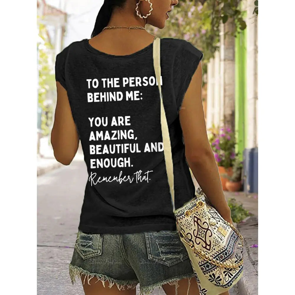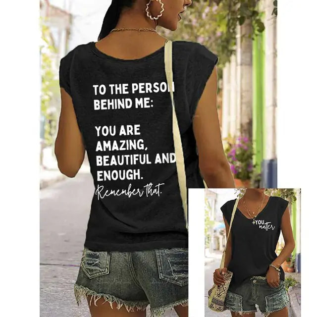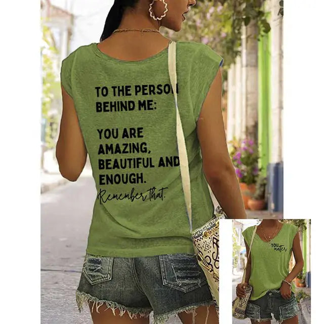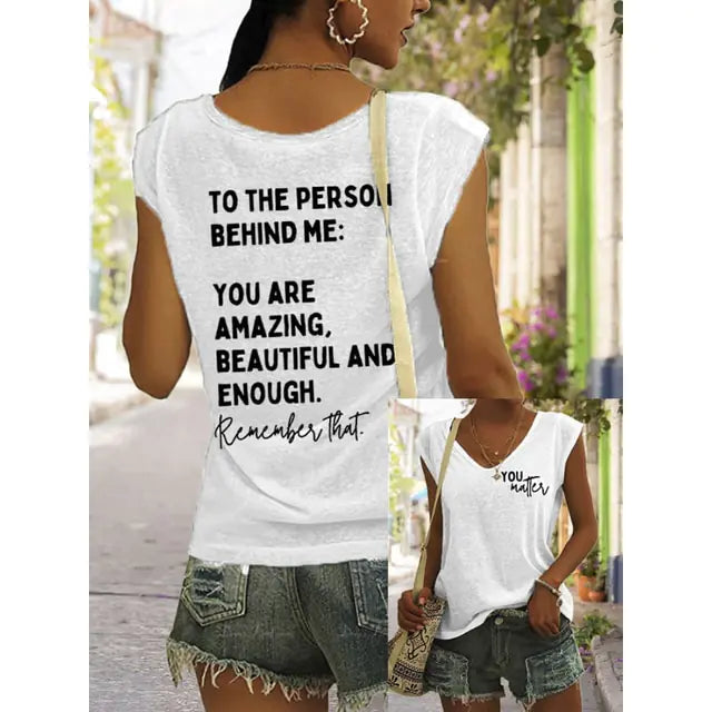 نقدم لك قميص Rheaclots النسائي الكاجوال بدون أكمام بطبعة "To The Person Behind Me You Matter" - إضافة أنيقة وذات مغزى لخزانة ملابسك. صُمم هذا القميص بدون أكمام مع وضع الراحة والأناقة في الاعتبار، ويتميز بتصميم جذاب بفتحة على شكل حرف V وقصّة مريحة مثالية للارتداء اليومي.