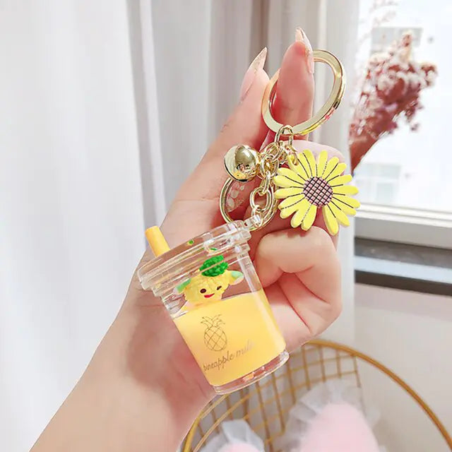 Fun and Functional: This delightful accessory features a charming combination of fruit and daisy motifs encased in a mesmerizing liquid quicksand design. It adds a playful touch to your keys or bag while keeping them secure.