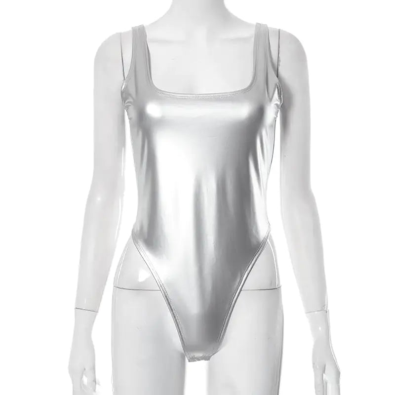 غيّر مظهرك مع بدلة الجسم اللامعة الجريئة بدون أكمام. يضيف لمستها المعدنية لمسة من التألق، مما يضمن لك التميز عن الآخرين وترك انطباع دائم.