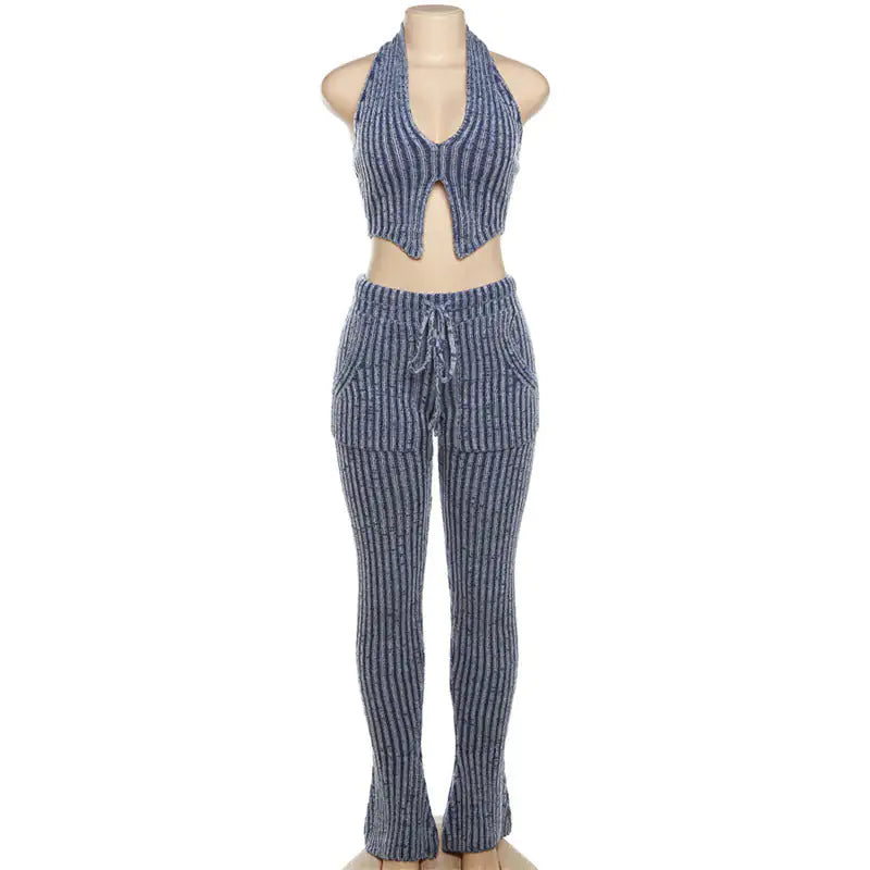 صُنع هذا الطقم من قماش ناعم ومرن، ويوفر التوازن المثالي بين الراحة والأناقة. يوفر الجزء العلوي بدون أكمام والسراويل الضيقة ذات الثنيات شكلًا ظليًا جذابًا، بينما يضيف الحياكة المضلعة لمسة من الملمس والرقي.
