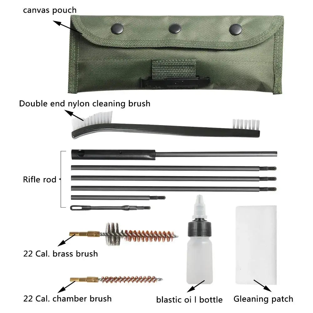 تأكد من الأداء الأقصى مع مجموعة تنظيف البندقية AR15 M16 M4 المكونة من 10 قطع، والتي تتميز بفرش مصممة خصيصًا لعيارات 5.56 مم، و.223، و22LR، و.22، وهي ضرورية للحفاظ على الأسلحة النارية الخاصة بك.