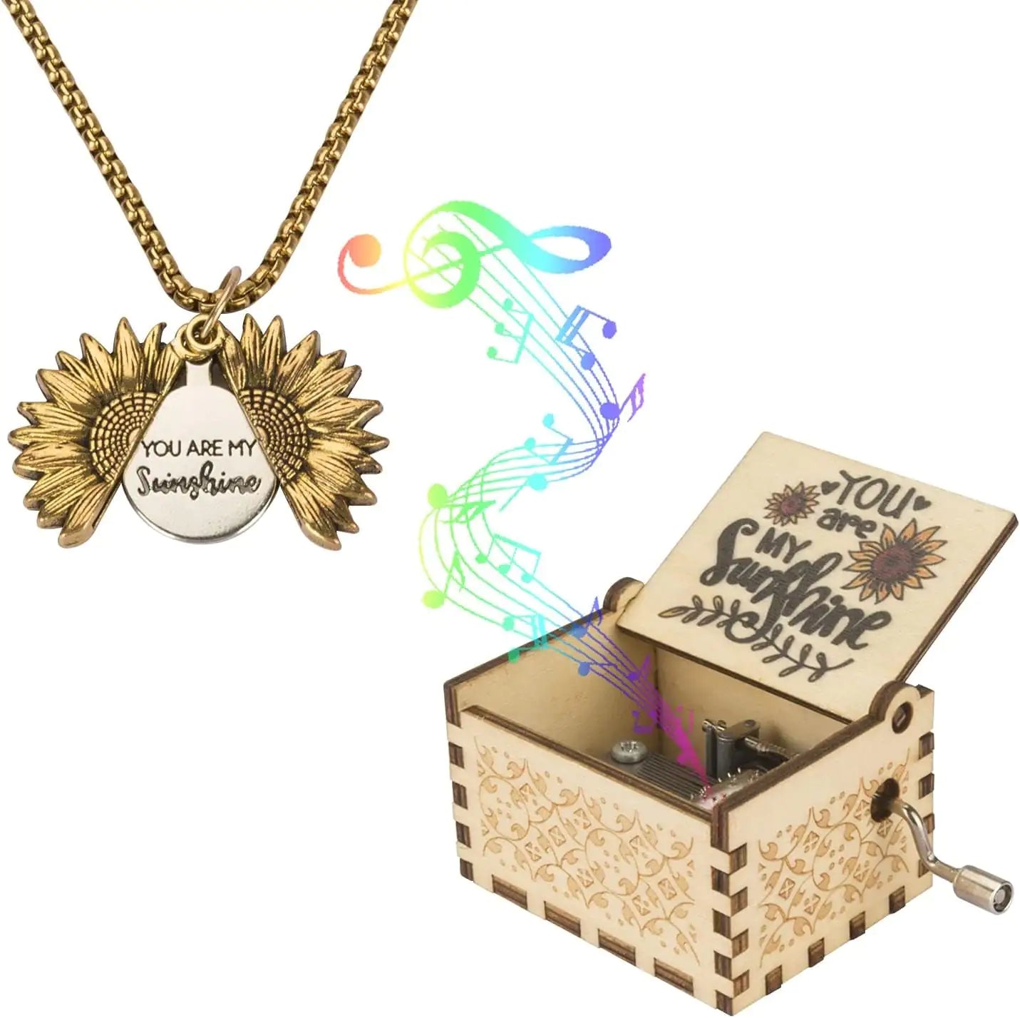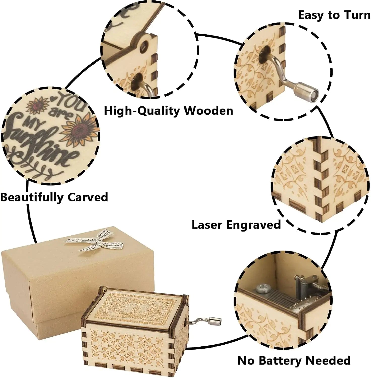 تم تصميم صندوق الموسيقى الخاص بنا بعناية فائقة للتفاصيل، ويتميز بتصميم كلاسيكي مزين بعبارة "You Are My Sunshine" المحبوبة. بلف بسيط للمقبض، يعزف اللحن الأيقوني، ويملأ الهواء بالدفء واللحن.