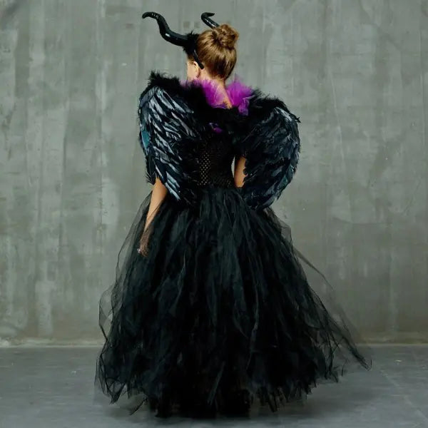 The shoulder straps are delicately embellished with dual-toned tulle in black and purple, enhancing the magical aura of the outfit. Accentuating the ensemble are the striking, oversized glitter Maleficent horns that measure an impressive 35cm by 30cm, designed to fit comfortably for all ages. Complementing the horns are feather wings with dimensions of 55cm by 40cm, adding a dramatic flair to your presence.