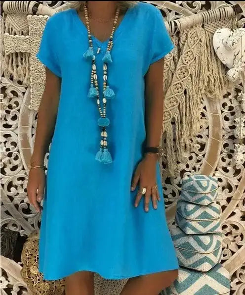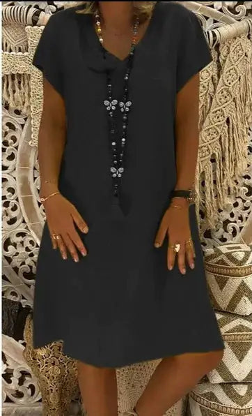 Experience the perfect blend of comfort and fashion with our casual V-neck midi dress. The soft, breathable fabric ensures you stay comfortable, while the flattering V-neck design keeps you looking chic.