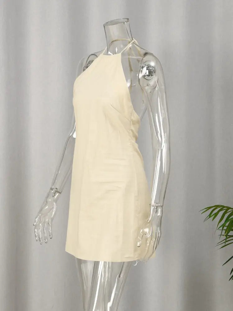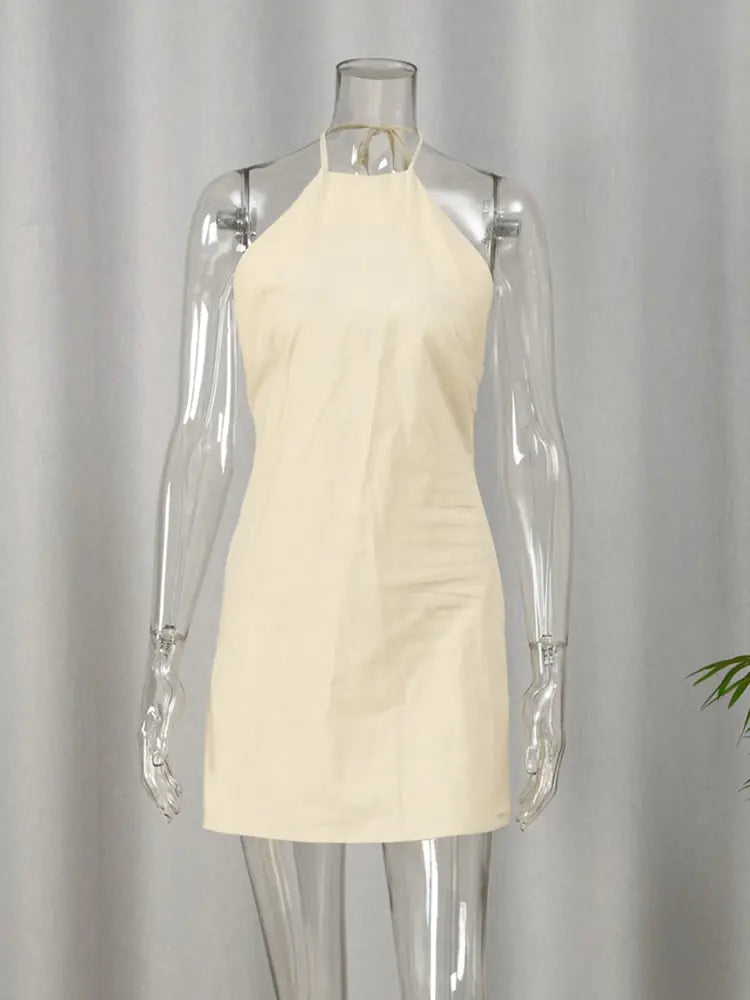 Elevate your wardrobe with our exquisite cotton and linen backless mini halter dress, perfect for any occasion. Whether it's a romantic dinner date or a summer soirée with friends, this dress will be your go-to choice for effortless elegance. The soft, breathable fabric ensures comfort, while the backless design adds a touch of allure to your ensemble.