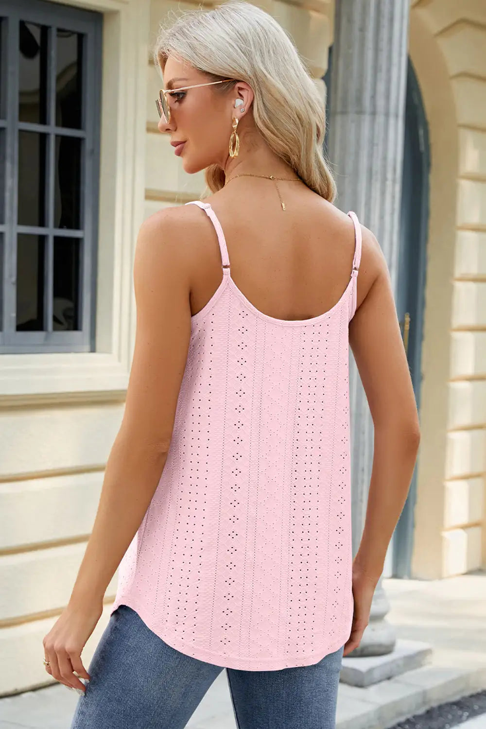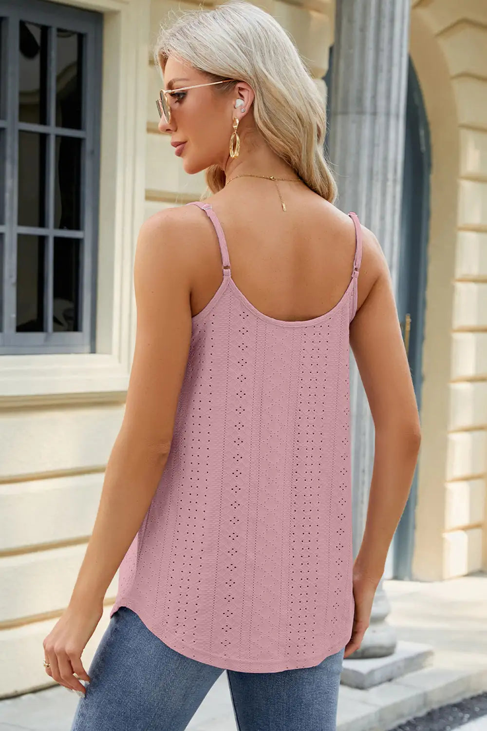 Enjoy the versatility of an eyelet scoop neck ruched cami. Whether paired with jeans for a casual day out or dressed up with a skirt for a night on the town, this cami effortlessly adapts to any style, making it a must-have in your wardrobe.