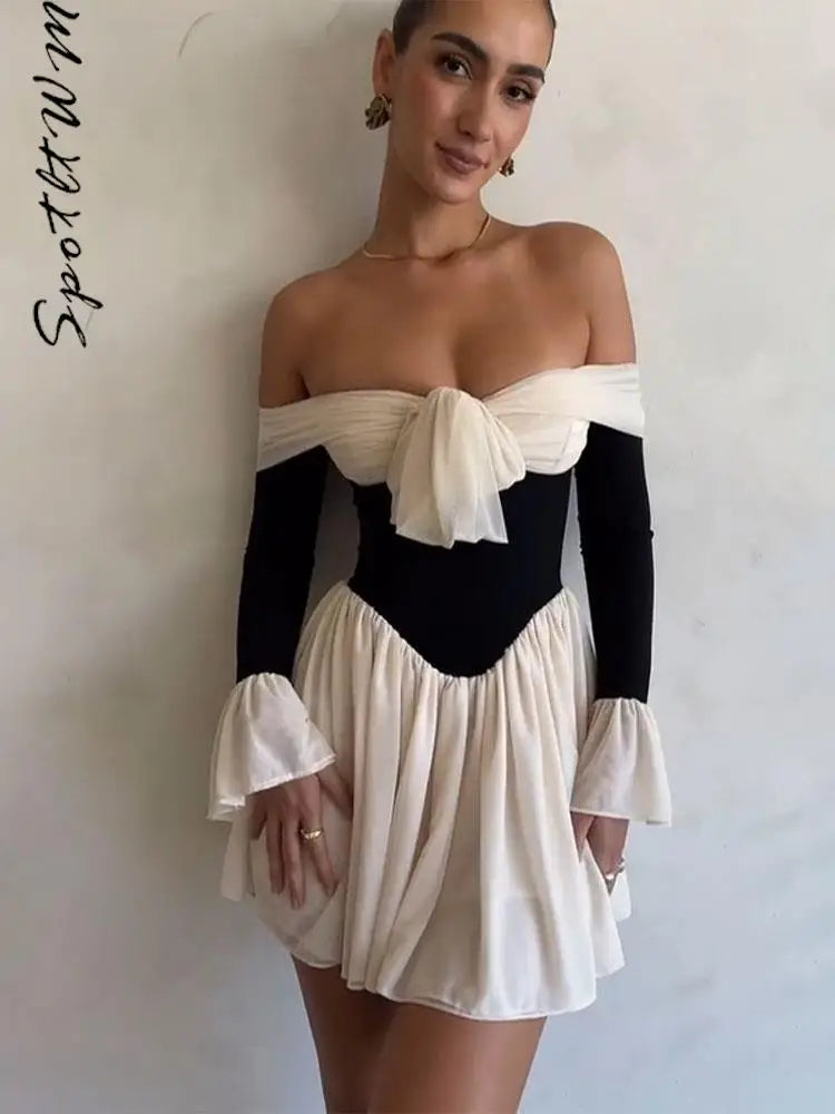 Elevate Your Style with this Chic Patchwork Off Shoulder Mini Dress