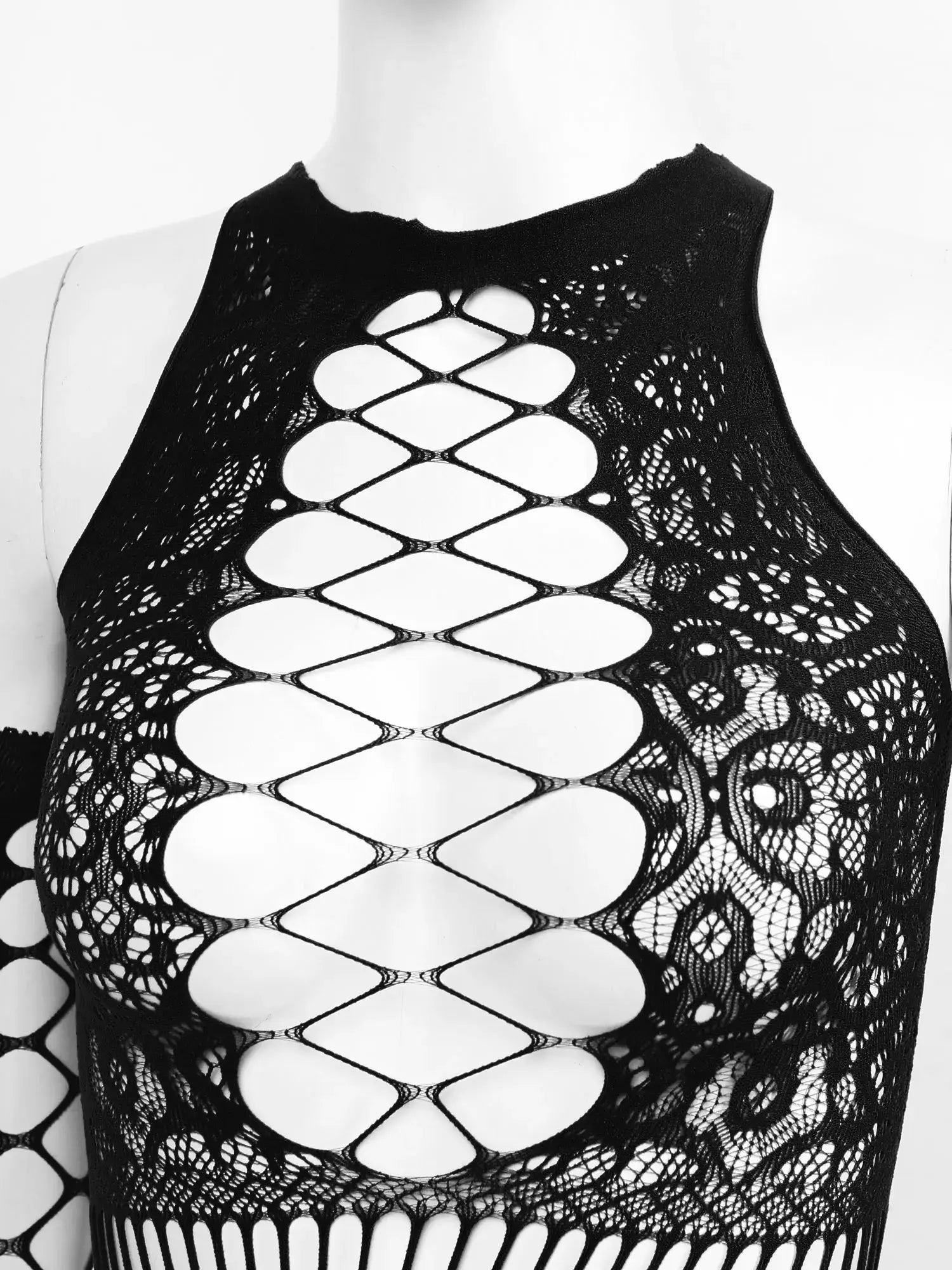 Embrace elegance with our Chic Sleeveless Fishnet Club Outfit. Featuring intricate mesh details, it's designed to elevate your clubbing experience with style and sophistication.