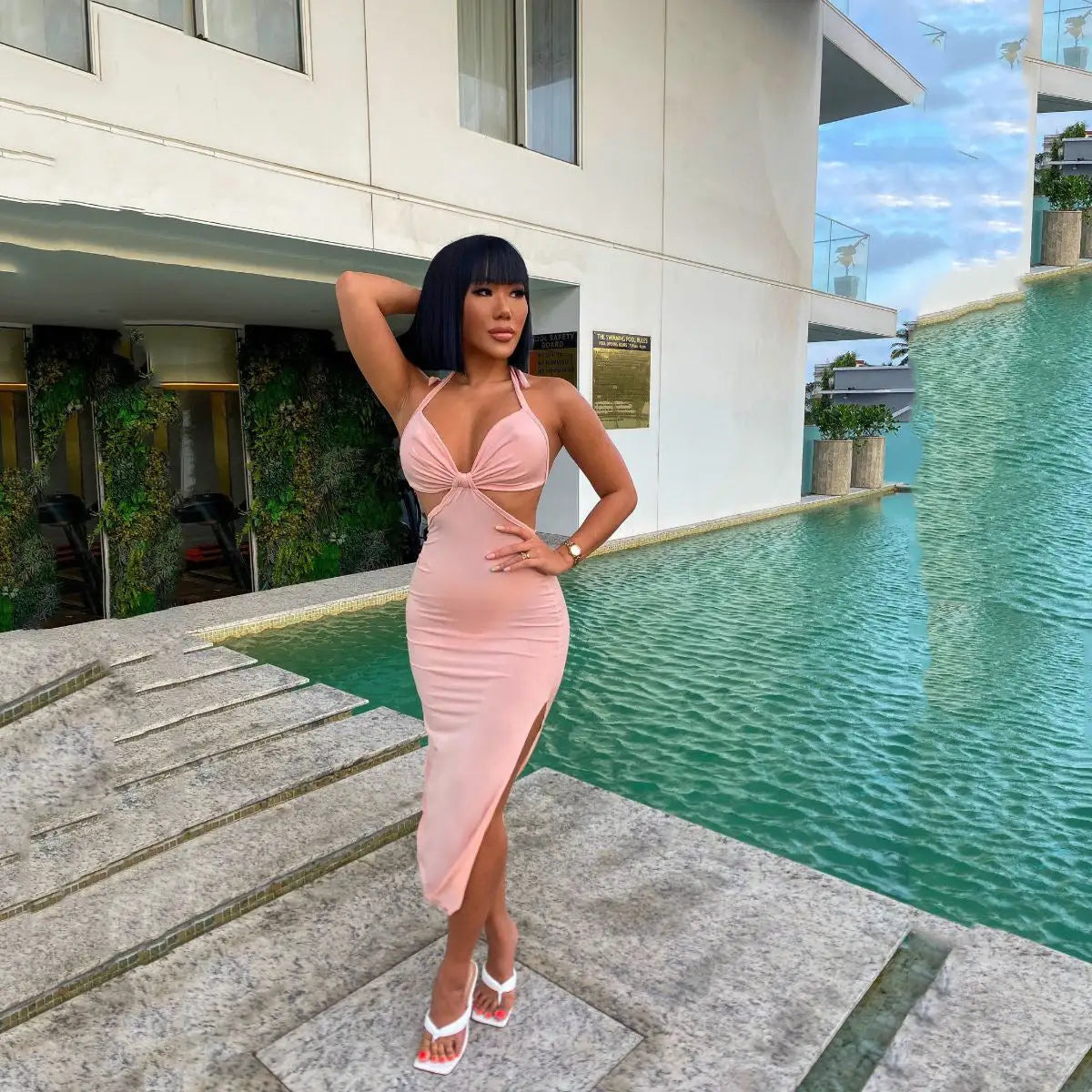 Fun and Flirty: With its halter neckline and slit detail, our dress adds a playful twist to classic elegance. Turn heads and make a statement wherever you go with this fun and flirty ensemble.