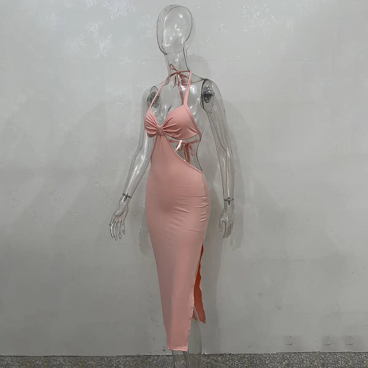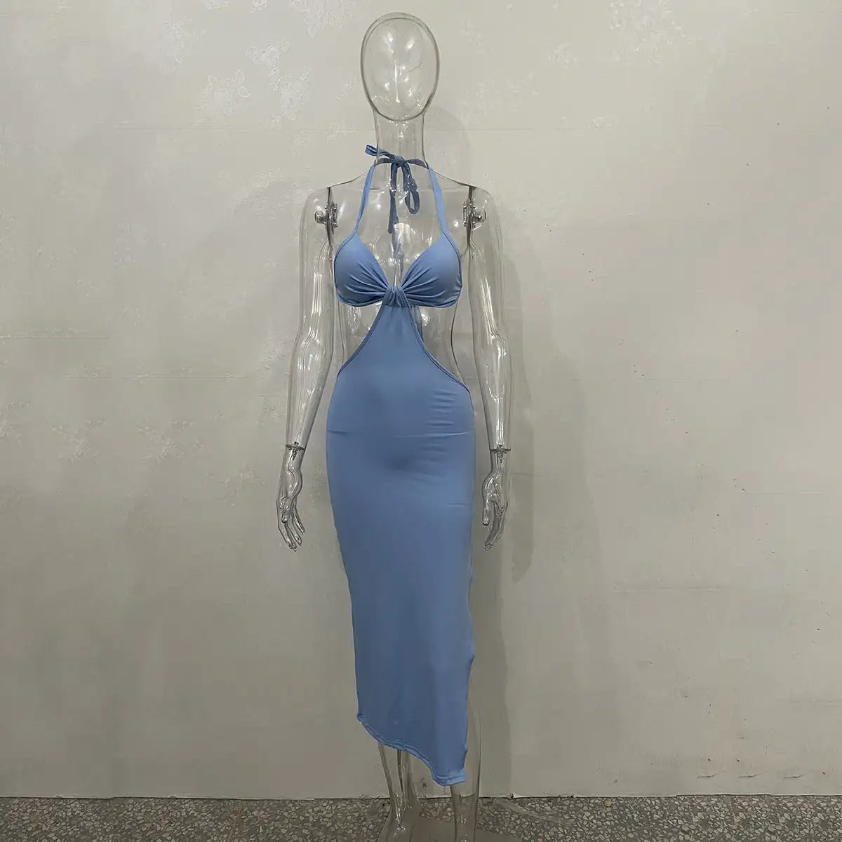 Professional Chic: Embrace sophistication with a touch of allure in our Halter Backless Slit Dress. Its sleek design and backless style exude confidence and style, making it perfect for a variety of occasions.