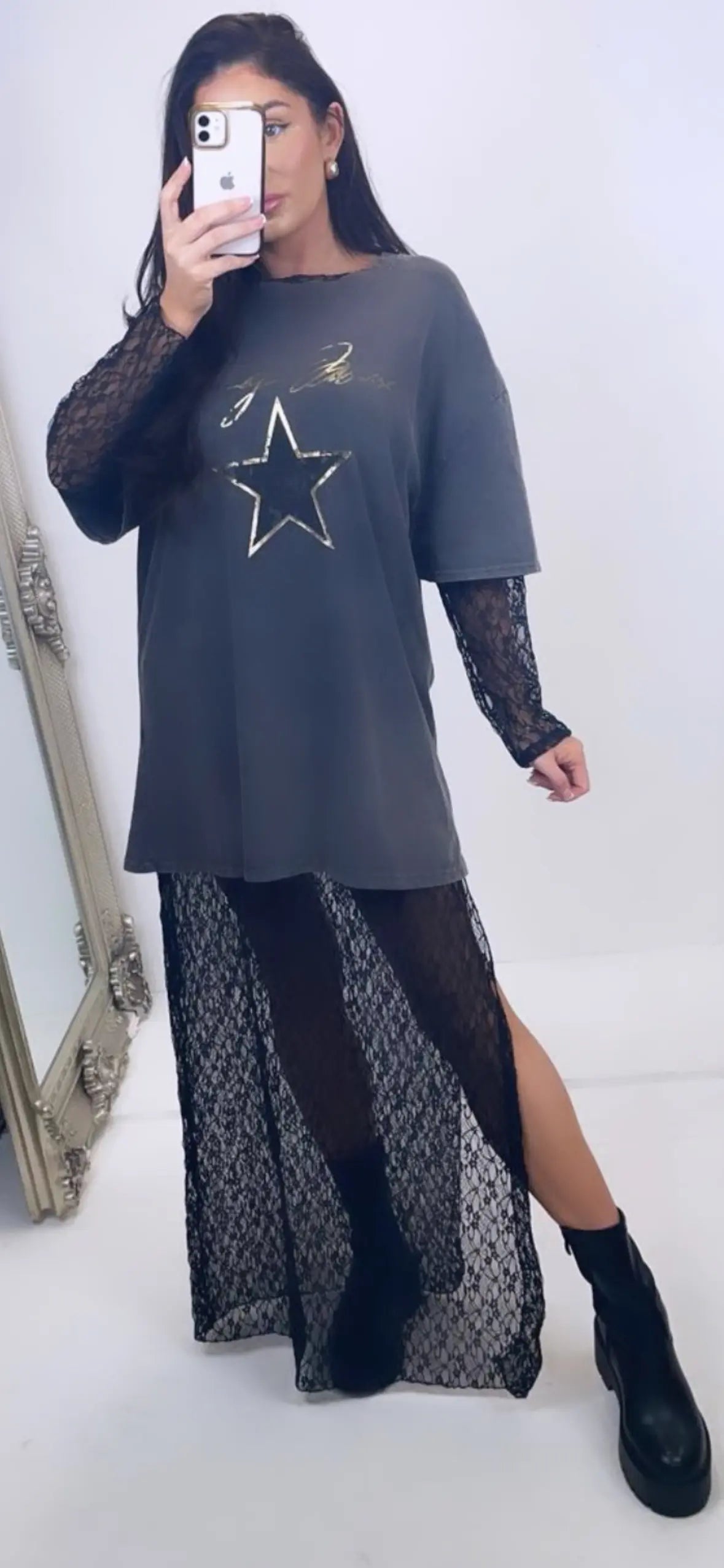 Experience comfort and sophistication with our Lace Dress with Acid Wash Tee. With its lace dress overlay and acid wash tee, this outfit is designed to keep you stylish and comfortable, making it an essential addition to your wardrobe for effortless dressing.