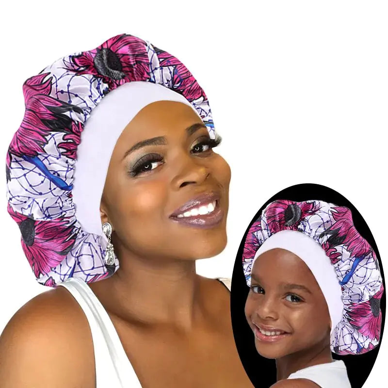 Discover the versatility and comfort of our satin bonnets designed for both moms and daughters. These bonnets are made from 100% polyester satin, offering durability and a luxurious feel. Available in one size that fits most adults, and with eight colorful designs, you and your child can enjoy matching hair accessories that combine fashion with function.