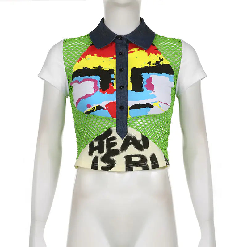 Mesh Around And Find Out Graffiti Button Polo Crop Top Unleash your boldness with the Mesh Around...