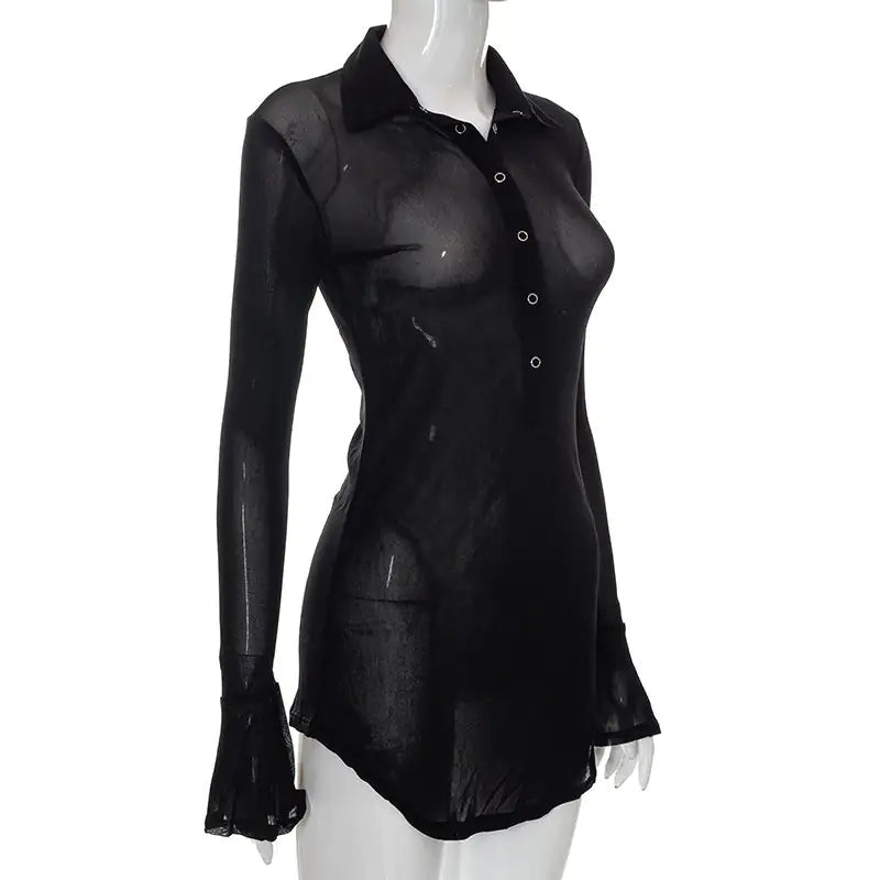 Elevate your look with the dress's stylish mesh detailing. The semi-sheer mesh fabric adds a layer of sophistication and allure, while the strategically placed buttons enhance the overall design, giving it a modern and edgy vibe.