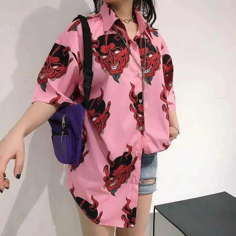 Make a bold statement with the Pink Demon Head Print Tidal Shirt, designed for those who aren't afraid to showcase their individuality. Whether you're a trendsetter or simply appreciate distinctive fashion, this shirt allows you to express your unique personality with its one-of-a-kind design. Stand out from the crowd and embrace your personal style with this must-have piece for fashion-forward individuals.