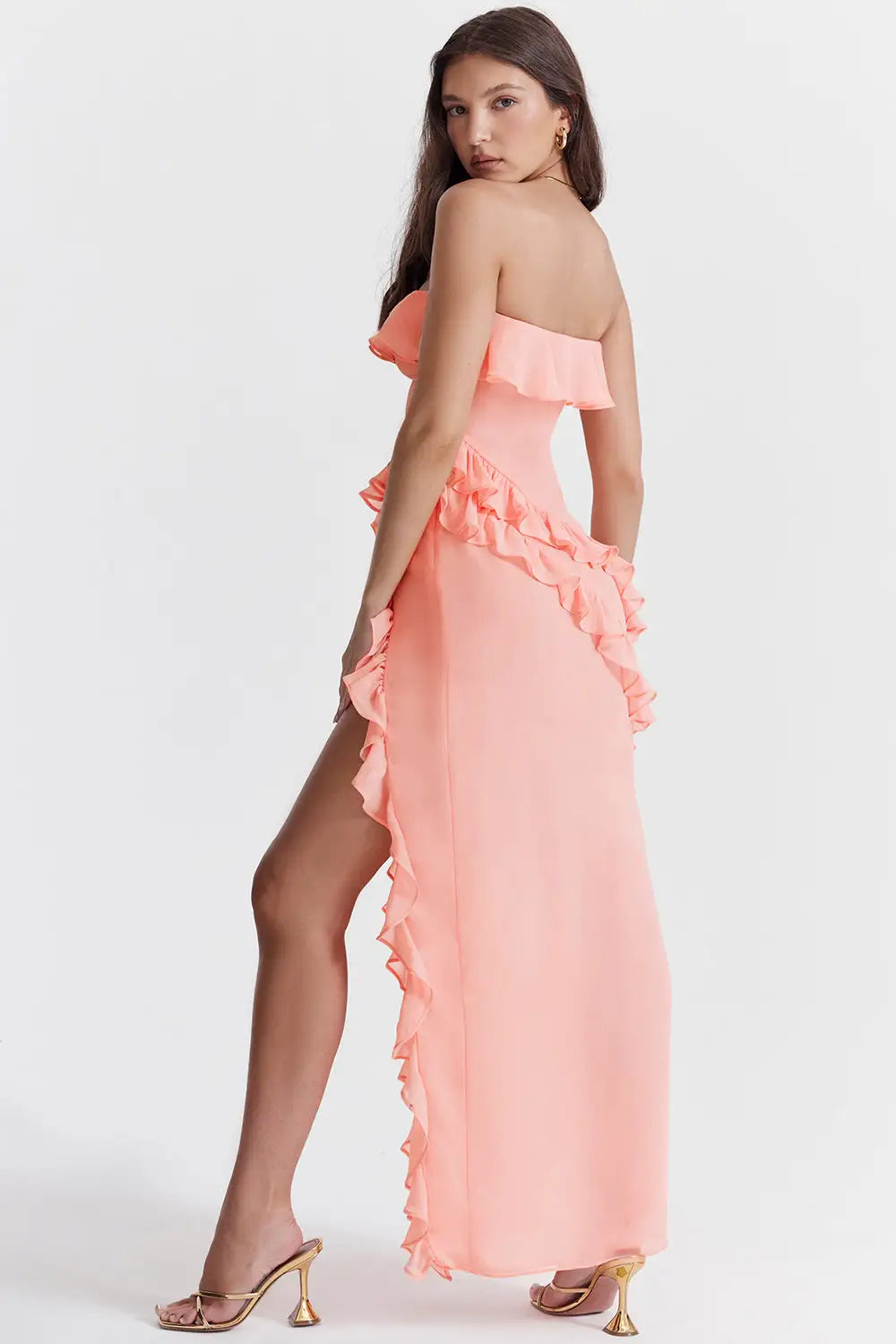 Embrace timeless elegance with the strapless design of our evening dress. The sleek, strapless neckline highlights your shoulders and collarbone, creating a refined and graceful silhouette that exudes confidence and poise.