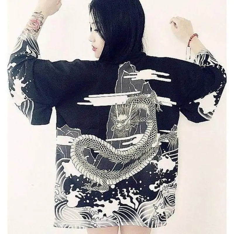 When you slip into the Streetwear Samurai Dragon Kimono, you transform into a modern warrior. The bold dragon design, inspired by ancient Japanese artistry, commands attention and respect. The lightweight fabric drapes elegantly over your shoulders, allowing you to move with grace and confidence. Perfect for both casual outings and making a statement at special events, this kimono elevates your style to a new level of sophistication.
